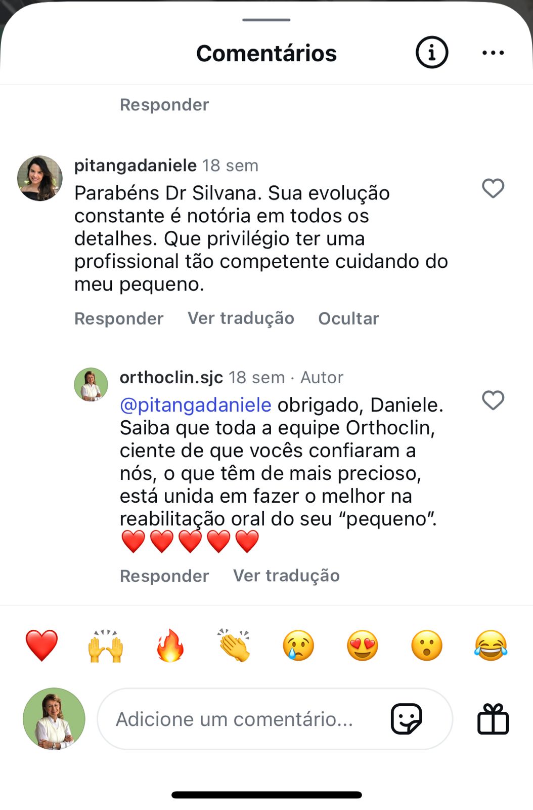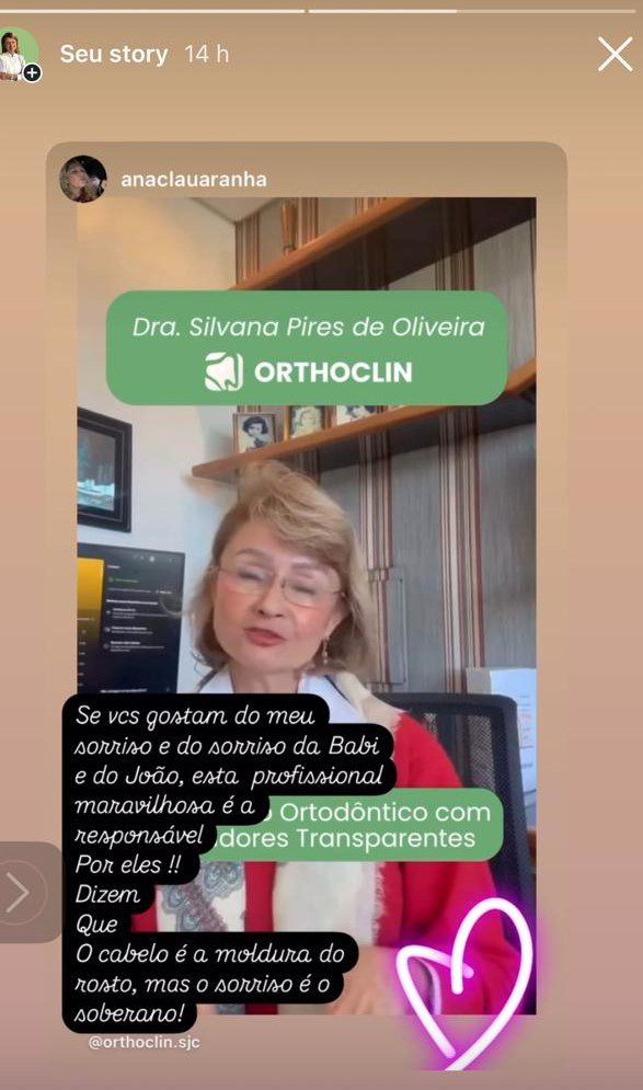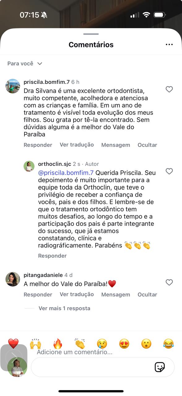 Elizangela, reconhecemos sua dedicação de esposa, profissional da saúde e mãe, se deslocando de sua cidade, para realizar o tratamento em São José dos Campos. Salientamos o quanto admiramos sua participação na obtençao dos objetivos dos tratamentos propostos aos seus filhos. Estou feliz por ter sido escolhida e também pelo profissionalismo da equipe da ORTHOCLIN, ter conquistado sua confiança, durante estes tratamentos ortodônticos que, certamente, beneficiarão seus filhos pela vida toda. Muito obrigado.❤️ CAROLINA BANDEIRA08/12/2024Trustindex verifica se a fonte original da avaliação é Google. Estou em tratamento ortodôntico e até agora minha experiência está sendo maravilhosa. A Dra Silvana é uma profissional extremamente qualificada e atenciosa, sempre prestando todo o auxílio para que o tratamento corra bem.